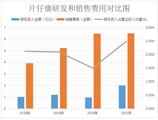 现阶段,片仔癀的研发投入占比在2%左右。2018-2021年,片仔癀的研发投入分别为1.01亿元、1.19亿元、9755.16万元、2亿元,研发投入占比分别为2.12%、2.09%、1.5%、2.49%。同期,2018-2021年,片仔癀的销售费用分别为3.92亿元、5.23亿元、6.47亿元、6.51亿元。